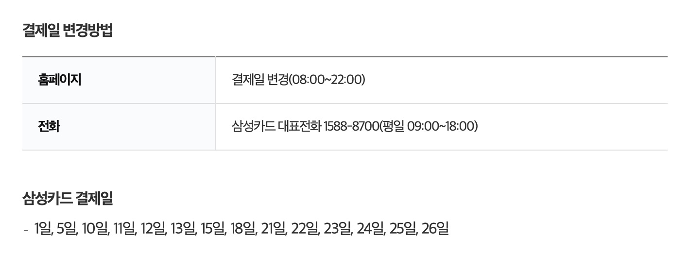 결제일변경은 홈페이지, 삼성카드 어플, 전화고객센터 등을 통해 진행하실 수 있습니다.