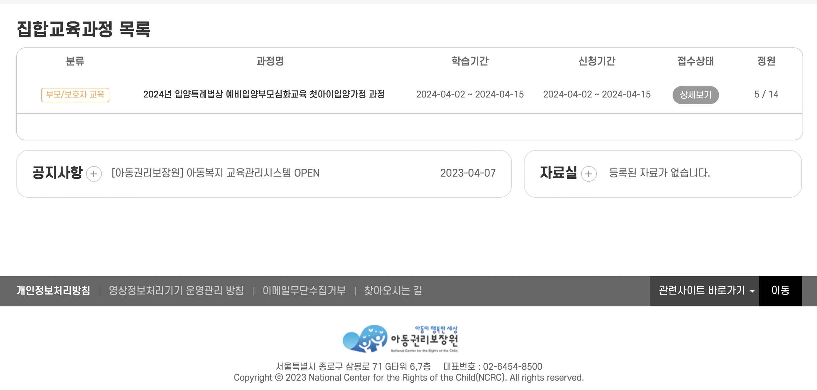 아동권리보장원 아동복지통합서비스 사이버연수원 교육과정을 보시면 권리일반, 아동교육, 부모/보호자교육, 종사자교육, 입양인식 개선교육, 자격/양성과정, 아동학대 예방교육, 실종예방교육, 아동정책 영향평가, 국내입양가정 심리정서지원사업, 아동정책 시행계획 등의 분류로 제공되고 있습니다.