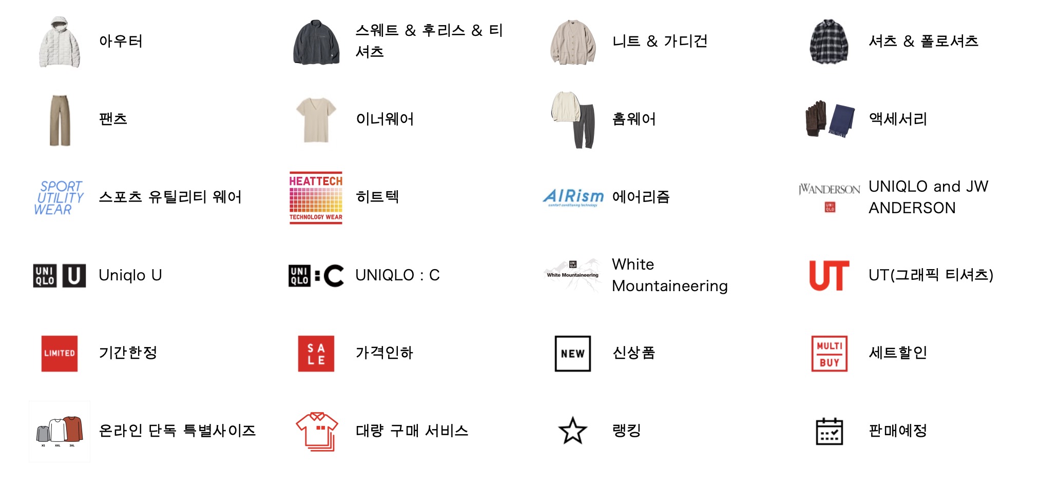 유니클로는 일상생활부터 사무실까지 다양한 상황에 맞는 스타일리시한 의류를 제공합니다. 주요 제품 카테고리는 다음과 같습니다: