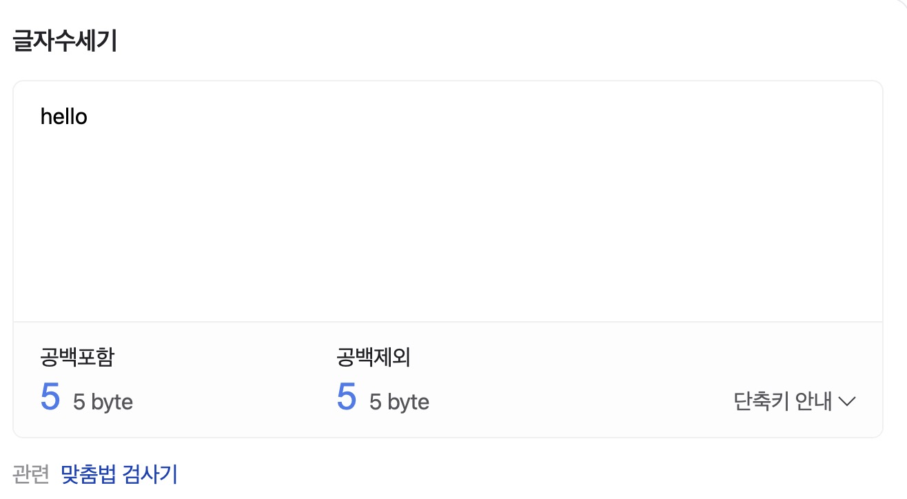 영어 hello 단어를 입력하니 딱 5바이트가 됩니다.